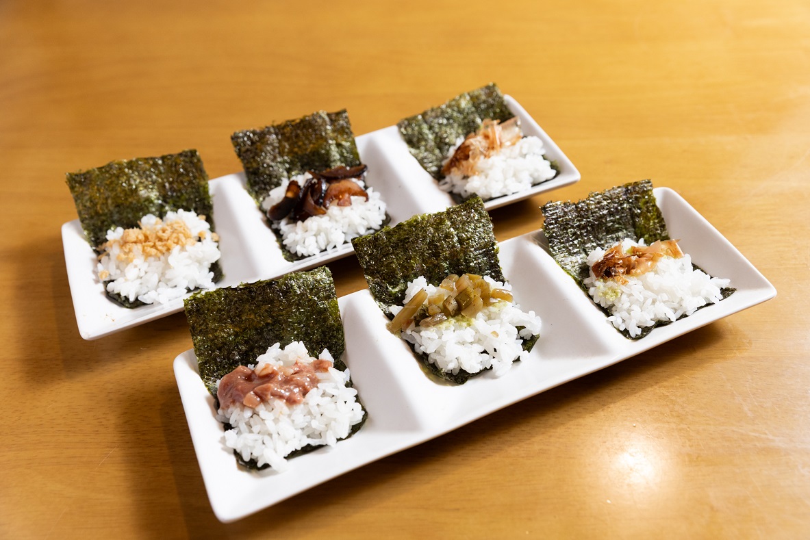 まず目を引くのは「一口ご飯」。海苔の上にご飯と具材をのせたもので、甘口と辛口の2種類を用意。ひと口サイズながら見た目のインパクトがあり、SNSやインターネットで写真を見て来店し、注文する人も少なくないとか。「おにぎりにするのは面倒くさいからね」と笑うご主人ですが、遊び心あるスタイルがこの店らしさです。