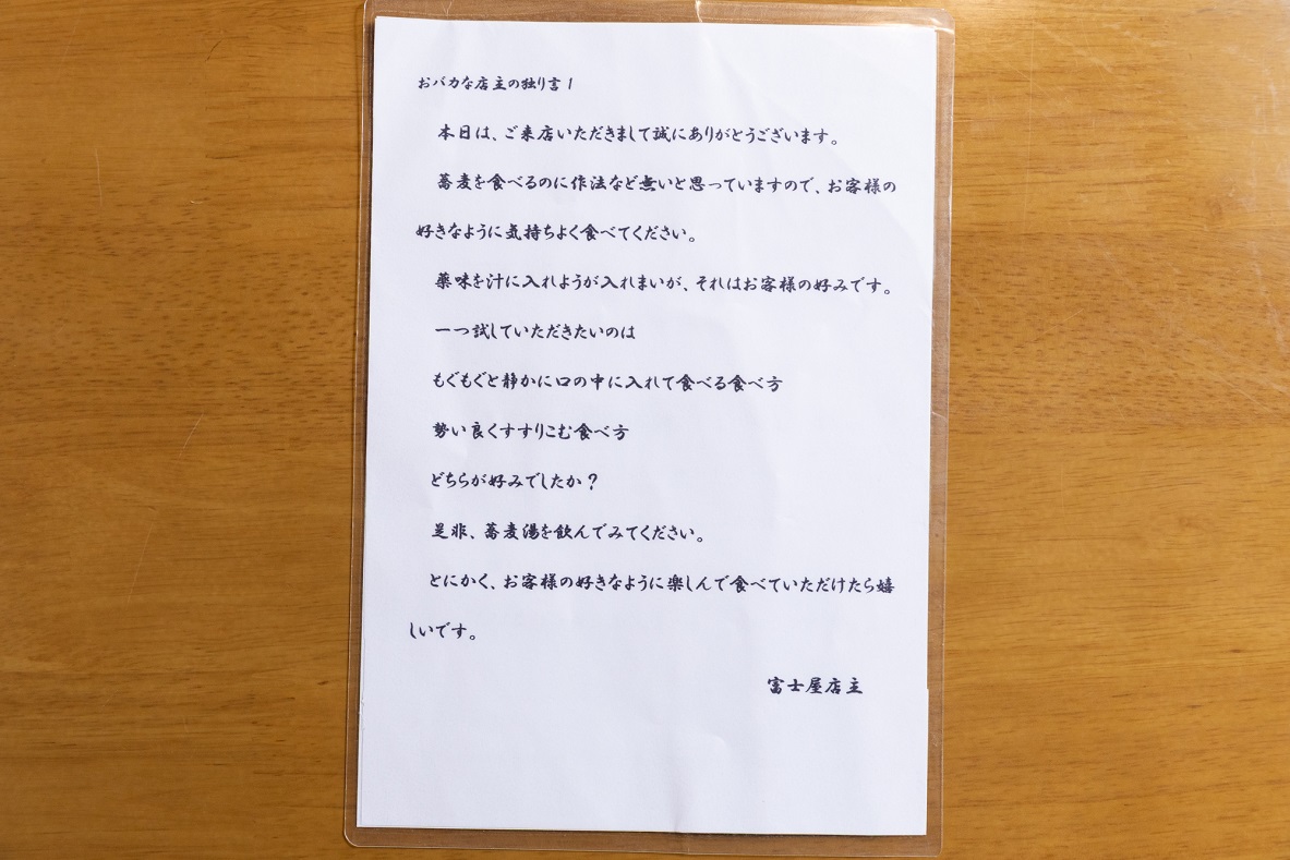 「食堂富士屋」の名物といえば、なんといっても極太の「太い蕎麦」。箸で持ち上げると重量感があります。「シャレで考えたんですよ」とご主人は笑いますが、インパクトがあるメニュー。塩をほんの少しつけていただけば、噛むごとに蕎麦の香りと旨みが楽しめます。仲間とシェアしたり、もり蕎麦とセットで食べ比べるのが常連のお客さんの定番だそうです。