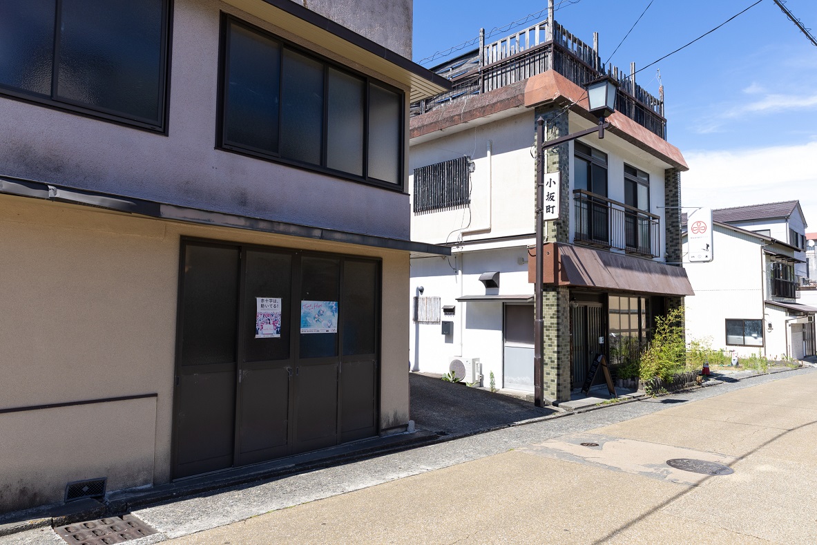 写真に写っている「小坂町」と書かれた看板が目印です。この路地(「Hostel Knot」の手前の道)を入り、約30m先の左手にあります