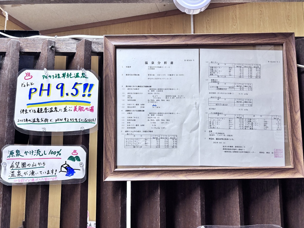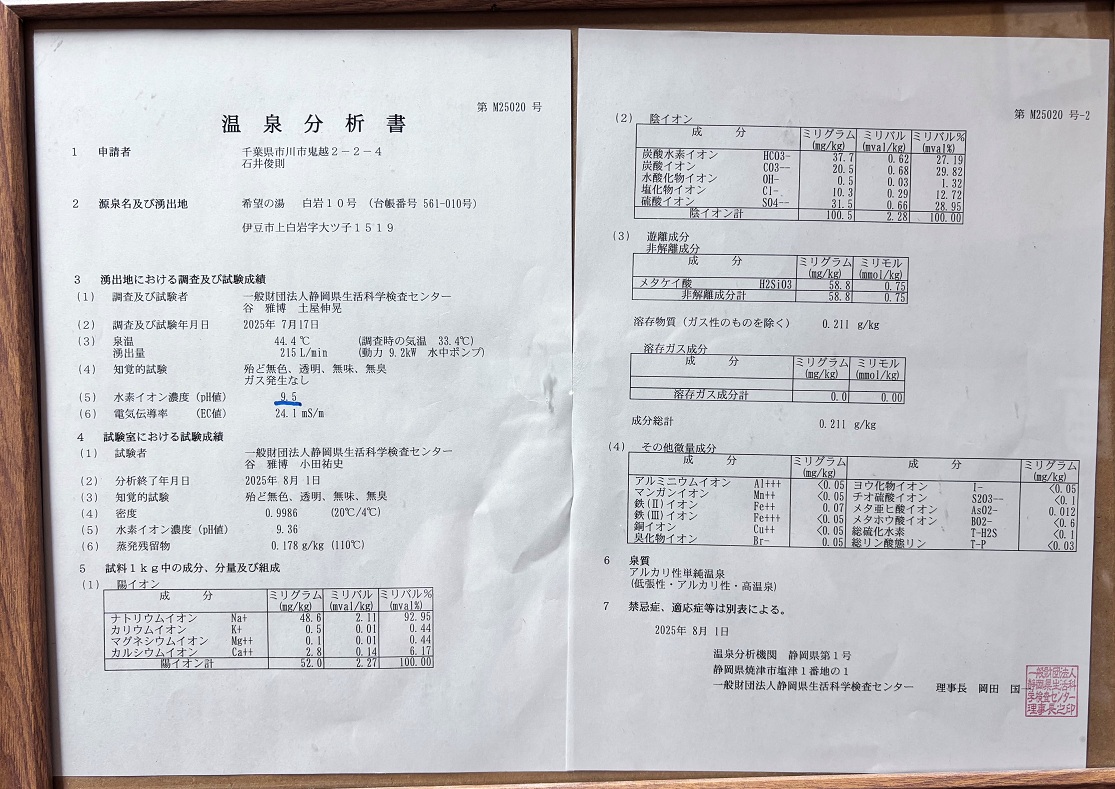 温泉分析書ではpH9.5、実測ではpH9.39という高いアルカリ性を示しています。