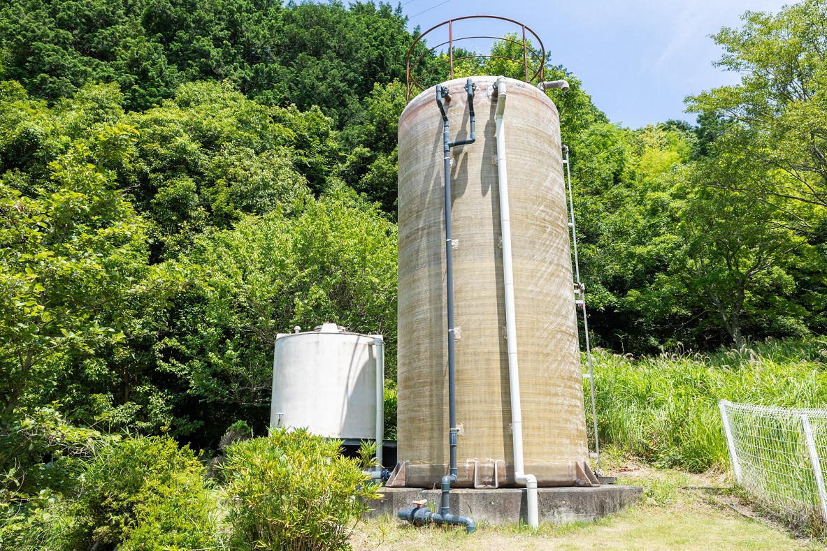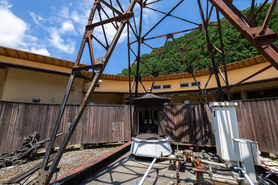 敷地の一角には、ここから温泉が湧いていることを知らせる「源泉やぐら」が、少し上がった場所にはタンクがあり、どちらもすぐ近くで見ることができます。温泉好きにはたまらない光景です。