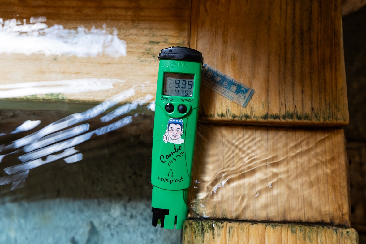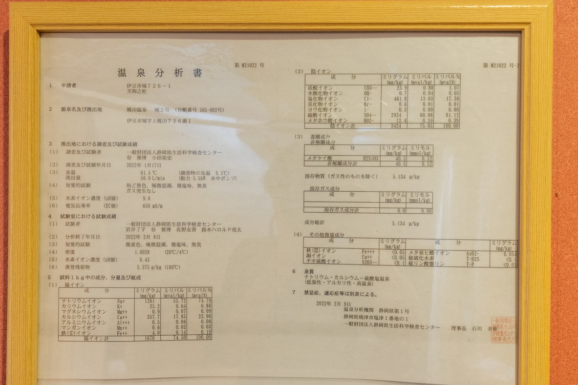 泉質はナトリウム・カルシウム-硫酸塩温泉で、無色透明、肌をすべるようなツルツル感のある美肌の湯。pHは温泉分析書によると9.60、実測で9.39のアルカリ性です。