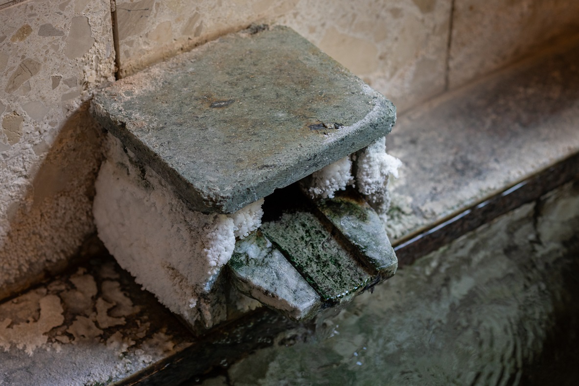 湯の華の付き具合は女将さんが日々チェックしていますが、取り除いてもすぐにまた付着してしまうとのこと。あまり触らないで、そのまま育てたら立派なアートになるのになぁ、と密かに思った井伊湯種ですが、細やかな手入れの中にも、この湯を大切に守り続けてきた時間の積み重ねが感じられました。