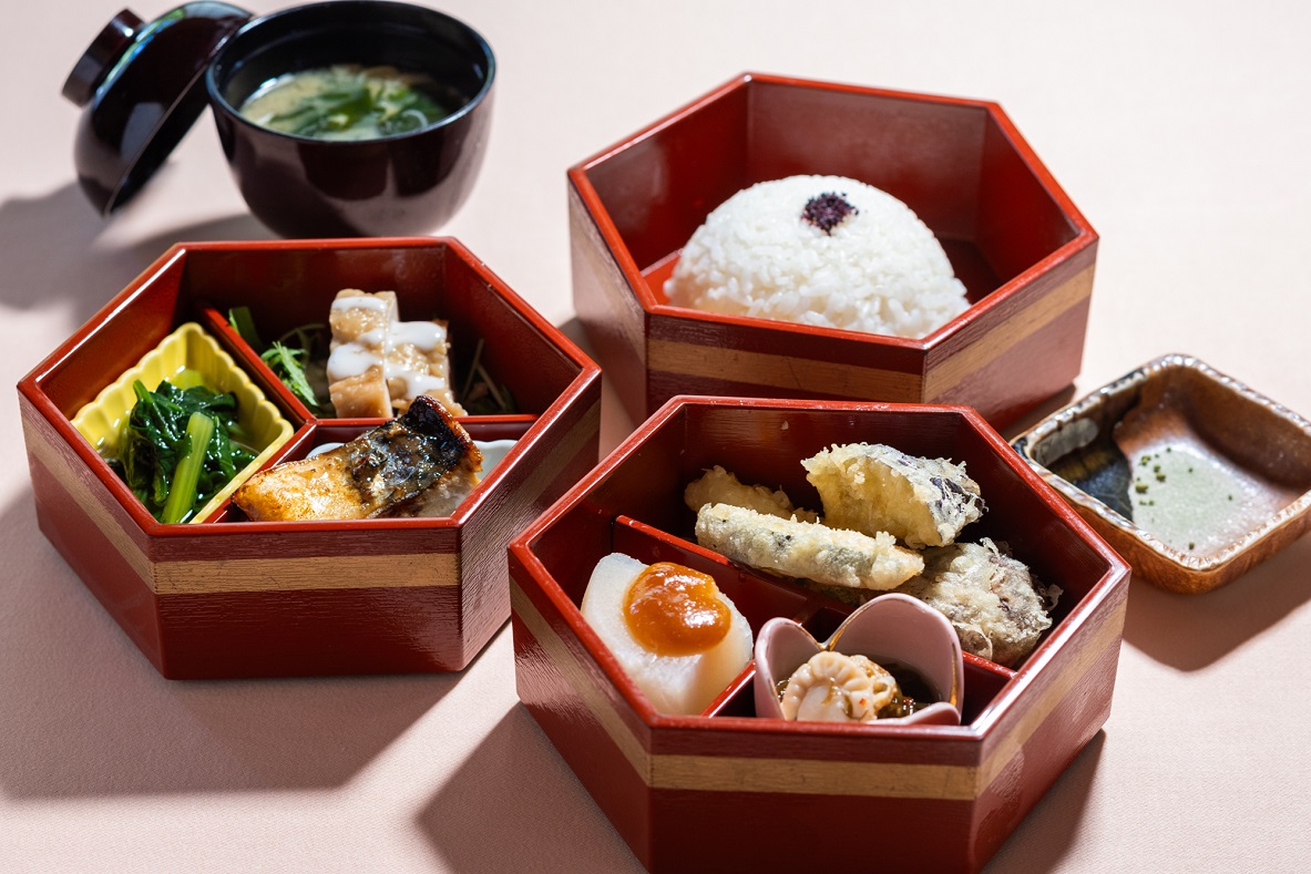 この日は「日替わりランチ」をいただきました。季節の野菜を使った天ぷらを中心に、手づくりの惣菜を少しずつ詰め合わせた三段のお重。一の重には、サバの塩焼き、味をしみ込ませて焼いた鶏肉、ほうれん草のおひたし。二の重には、シイタケやナス、カボチャなどの天ぷらに、ふろふき大根、ホタテともずく酢を合わせた一品。三の重には、ゆかりがのったご飯とお味噌汁が添えられ、彩りも美しい献立でした。