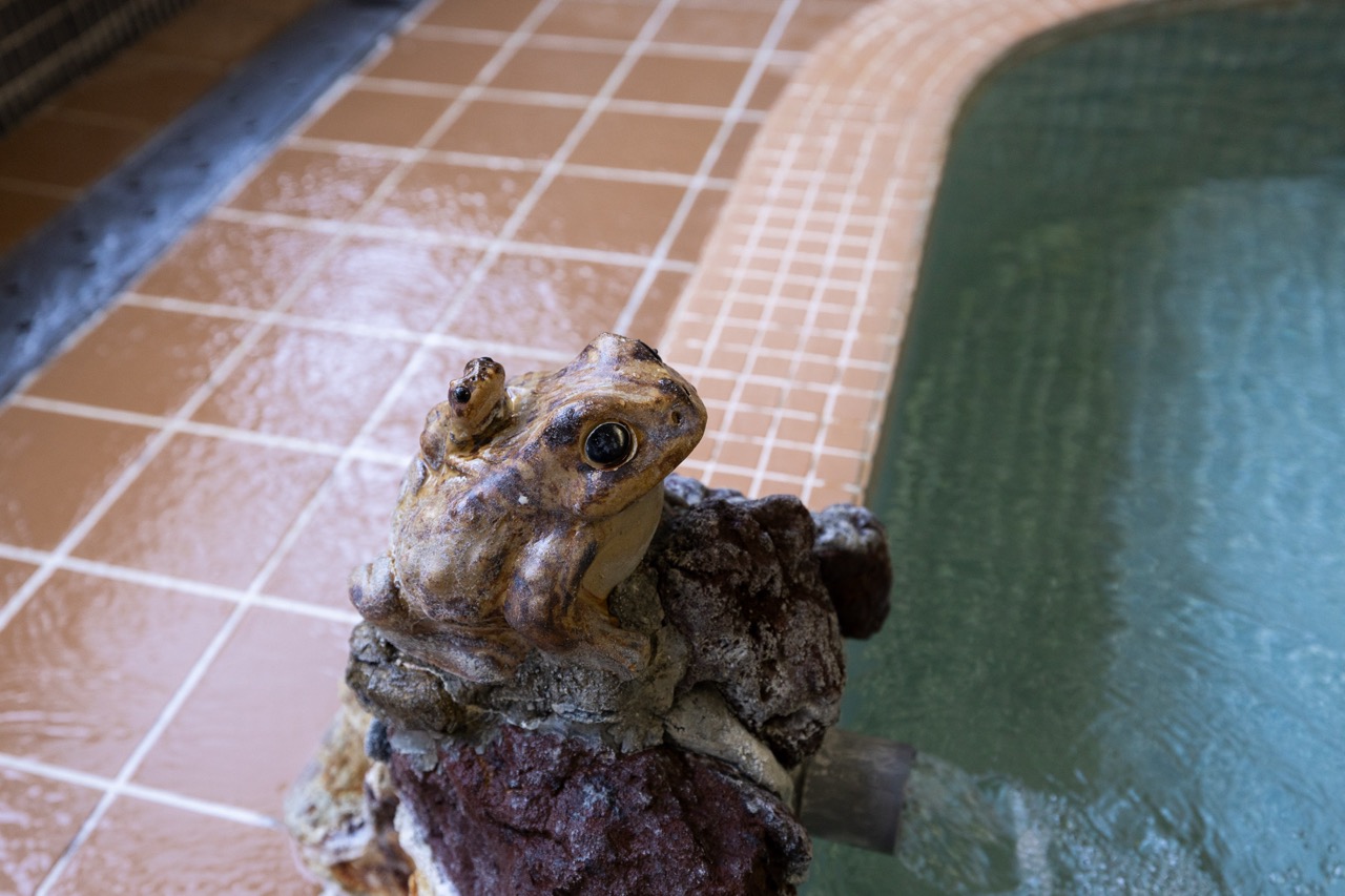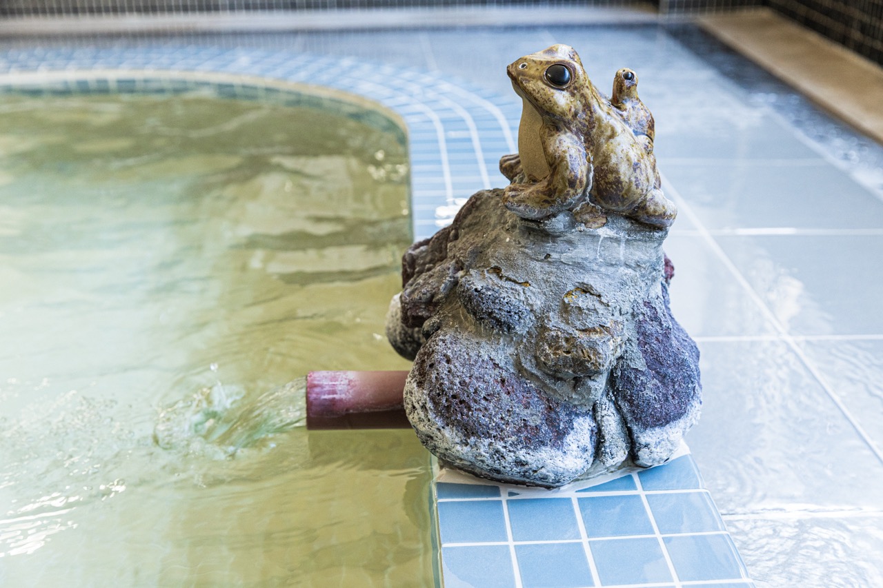 浴槽には、カジカガエルの親子をかたどった湯口から源泉が勢いよく注がれ、湯が縁から贅沢にあふれ出す様子を見ることができます。