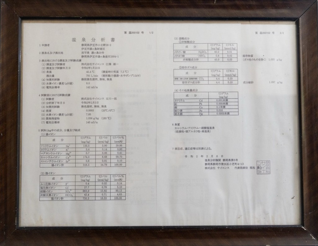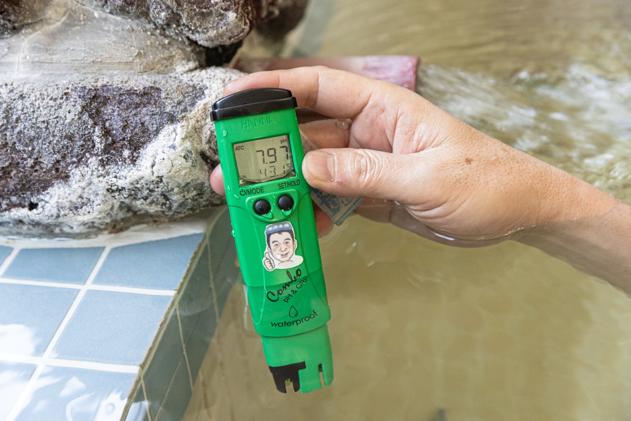 分析書にはpH8.0、源泉温度は45.4℃と記載されており、取材時の実測値はpH7.97、お湯の温度は43.1℃でした。