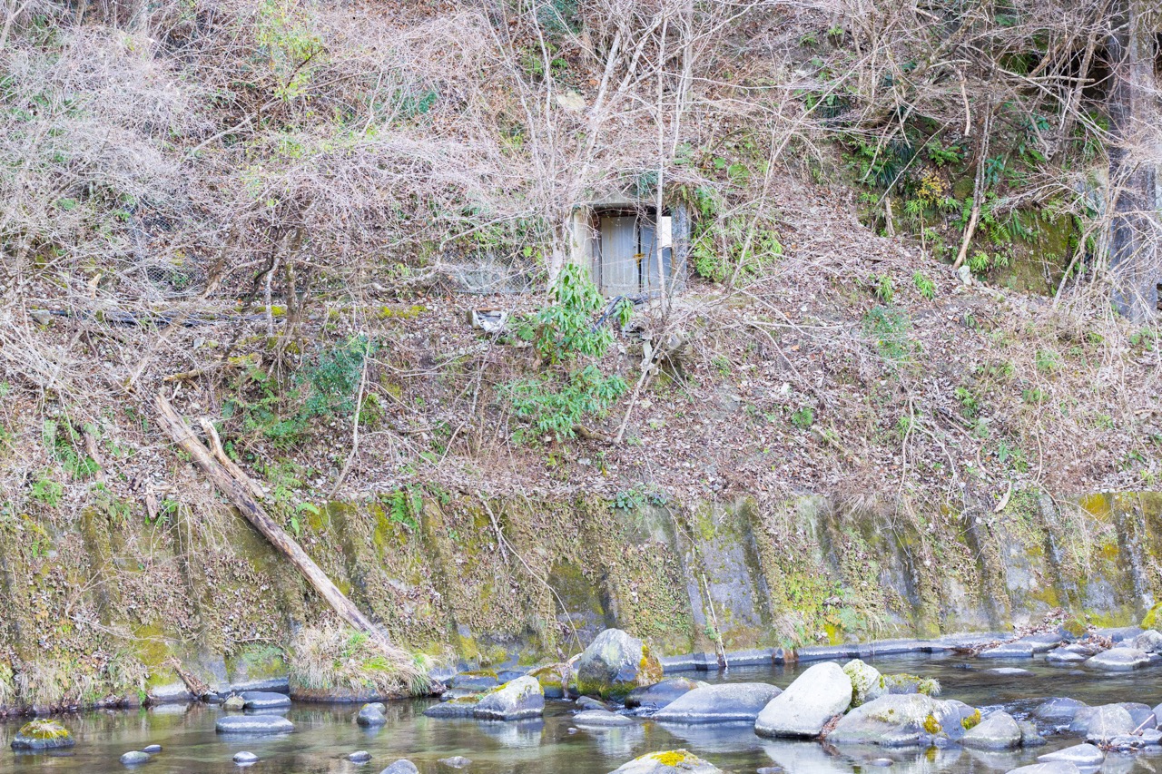 「河鹿の湯」の前を流れる狩野川の対岸を見ると、コンクリート製の扉のような入り口が見えます。